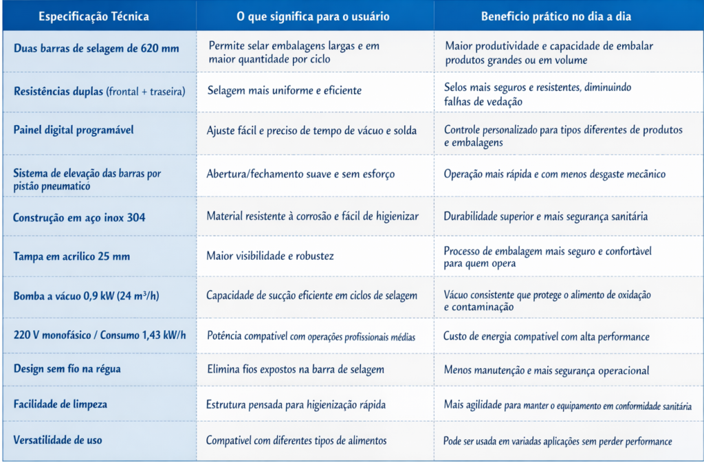A VAC 620-D foi projetada com o objetivo de facilitar o trabalho diário, aumentar a produtividade e garantir máxima segurança alimentar. Veja os principais diferenciais: